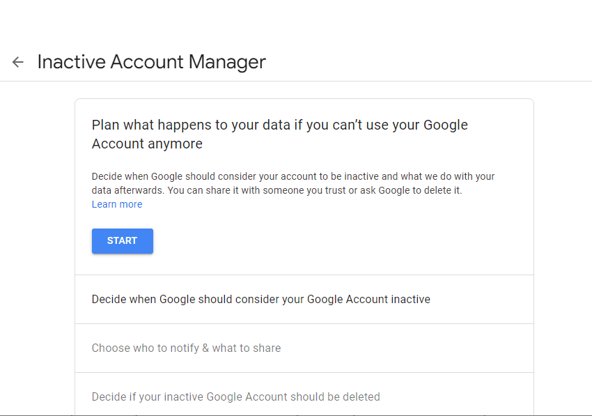To turn on this option, log into myaccount.google.com/inactive. You can choose what parts of your account to share with others. Google will only send a notification when your account is inactive for a certain period of time, but you must specify how long. Then, your trusted contact will receive an email from Google. The email will contain a list of everything in your account that you have given them access to and a personal note that you can write yourself.