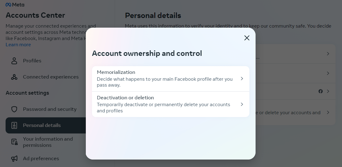 To access memorialization options, click on icon in the upper right-hand corner. On the Facebook website, it will be your profile picture; in the Facebook app on your phone, it will be three horizontal lines. Select the Settings and Privacy option, then Settings. Open the Meta Accounts Center and select Personal details.